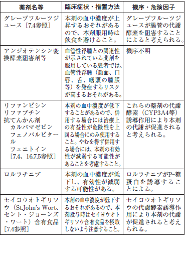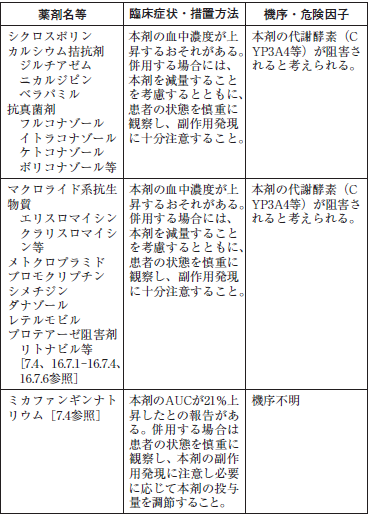 本剤は、肝薬物代謝酵素CYP3A4により代謝され、また、本剤はP-糖蛋白の基質であり、本剤自体もCYP3A4を阻害する。CYP3A4又はP-糖蛋白阻害あるいは誘導作用を有する薬剤との併用により、本剤の薬物動態に影響を及ぼす。CYP3A4又はP-糖蛋白阻害あるいは誘導作用を有する薬剤については、他の類薬に変更する又は当該薬剤を休薬するなどを考慮し、CYP3A4又はP-糖蛋白に影響を及ぼす薬剤との併用は可能な限り避けること。[7.4、16.4参照]